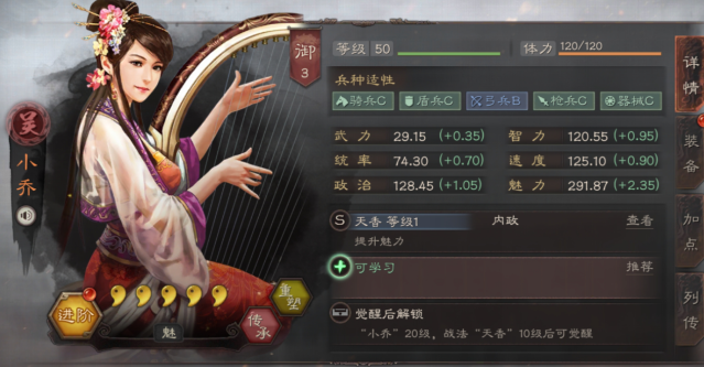 司马徽的兵种适性中弓兵为B级,其他均为C级,但这不影响内政效果。他的定位纯粹是内政官,千万别派他上阵打仗。如果同时拥有小乔、大乔等高魅力武将,可以轮流委任寻访使,利用他们的叠加加成。记住高阶奖励概率存在隐藏上限,超过25%后收益会递减,所以不必追求极限堆叠魅力。