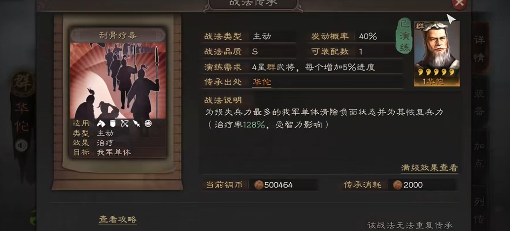 刘备携带陷阵营时,通常搭配暂避其锋、刮骨疗毒等减伤治疗类战法;若使用藤甲兵,则需警惕火攻队伍。骑兵阵容中,八门金锁阵或锋矢阵能弥补刘备速度不足的问题。兵书方面,九变系的援其必攻和励军是通用选择,可强化治疗与团队增益效果。刘备作为主将时虚弱概率提升至25%,兵种应以保障生存为主,例如盾兵配合军民减伤。