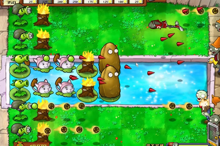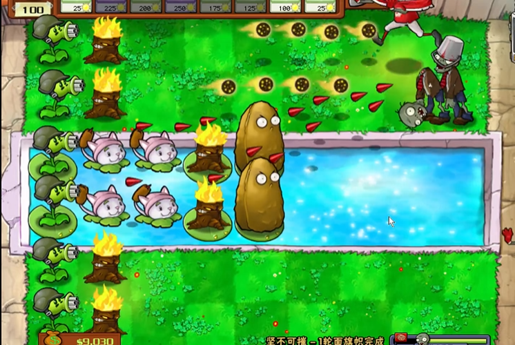 摆阵型时记住前防后攻原则,前排用高坚果或南瓜头扛伤害,后排集中火力输出。泳池行最容易被忽视,记得用荷叶铺路后放猫尾草,它能自动追踪僵尸。陆地行每排至少放两列双发射手,中间穿插火炬树桩提升伤害。阳光别一次性花光,留点备用补南瓜头或应急植物。每波结束后会给奖励阳光,记得及时补强薄弱位置。