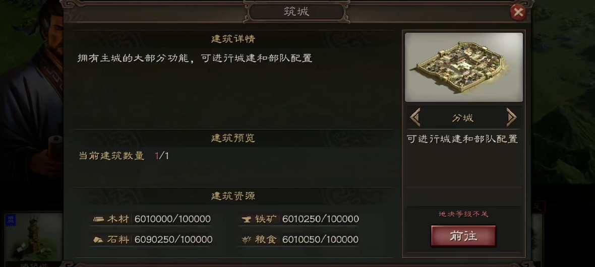分城建设是拓展势力范围、提升资源产出的重要策略。建造分城需满足三个核心条件:名声值达到6000解锁功能,占领呈H型分布的11块连地且中心地块等级不低于6级,储备木材、铁矿、石料、粮食各10万资源。满足条件后,点击中心6级地选择筑城功能,消耗资源并等待5小时即可完成建造。分城与主城资源互通,但建筑、科技、军队需独立发展,初期需合理规划资源分配以避免主城发育滞后。