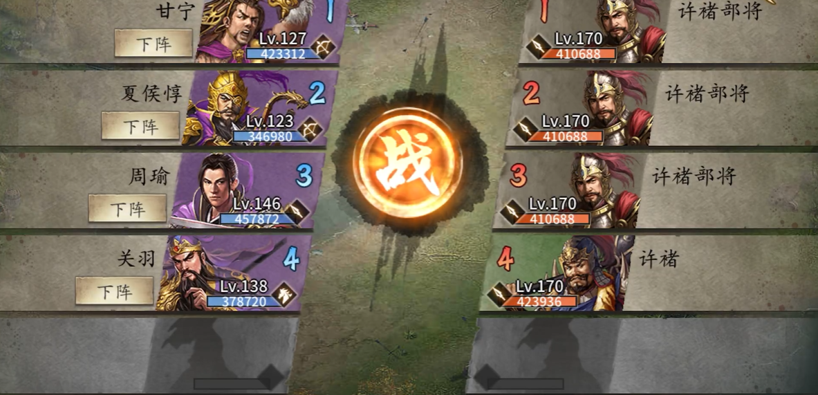 平民玩家挑战许褚注意兵器等级和装备分配。最低配置要求攻击40级、防御43级、兵力38级,推荐使用夏侯惇、甘宁、马超、吕蒙四人组合。最优物理装备分配给夏侯惇发挥水域克制,强壮装备集中于甘宁增强战法输出,吕蒙和马超平均分配剩余资源。出场顺序应为吕蒙→夏侯惇→甘宁→马超,吕蒙负责消耗首轮兵力,夏侯惇最后一排放战法并承受第三部将攻击,甘宁战法释放时机需精确控制以格挡许褚技能。