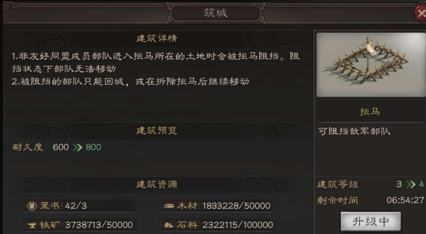 防守工事的布阵需要综合考虑地形、建筑功能与兵力调配。拒马与箭塔是核心防御建筑,拒马能直接阻挡非友好同盟部队行进,迫使其拆除或撤退;箭塔则提供2格视野并自动攻击范围内敌军。两者需配合君王殿4级及工事营1级条件建造,拒马应布置在行军要道,箭塔则需覆盖拒马后方2格范围以形成火力交叉。战场建筑等级直接影响守军强度,需优先升级。