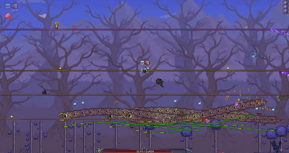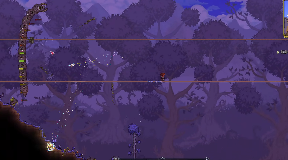 世界吞噬者的分裂机制是战斗难点,每段躯干被摧毁后会生成两条独立蠕虫。优先攻击头部可减少分裂次数,分裂后的小型蠕虫血量继承原躯体,需逐个击破。若战斗失败,BOSS会在玩家死亡地点游荡,需重新召唤并恢复其全部血量。战斗中可利用钩爪固定位置持续输出,或通过绳梯悬空规避近战伤害。