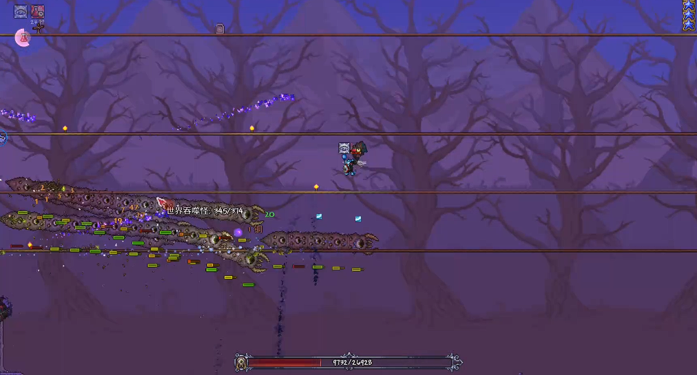 战斗场地建议选择腐化之地的开阔区域,搭建长平台并放置篝火、心形灯笼以提升生命恢复。穿透性武器如链球、长矛或爆炸物能高效打击多段躯体,而高击退效果的武器可限制BOSS移动。专家模式中需注意其腐蚀唾液攻击,建议使用陨铁套装搭配空间枪或铂金弓配小丑箭。击败后掉落暗影鳞片和魔矿,用于制作暗影系列装备。