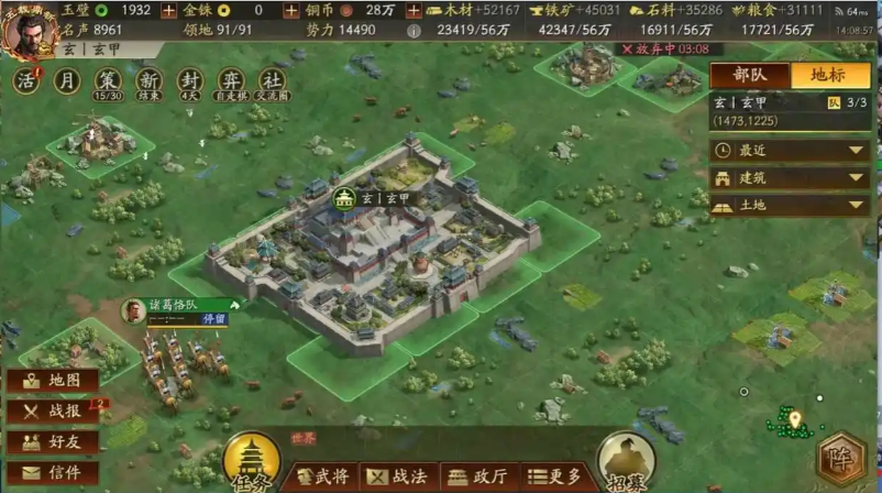 开荒阶段要严格控制战损,尽量选择克制兵种打地,避免越级挑战。前期以低级地为主,战损控制在100兵力以内,优先占领木材、铁矿、石料资源地,粮食可以稍后再考虑。随着武将等级提升,逐步挑战更高级的地块,但一定要确保兵力充足,避免翻车。如果遇到高难度地块,可以先派少量兵力侦查或碰瓷,降低守军兵力后再主力进攻,这样能大幅减少战损。