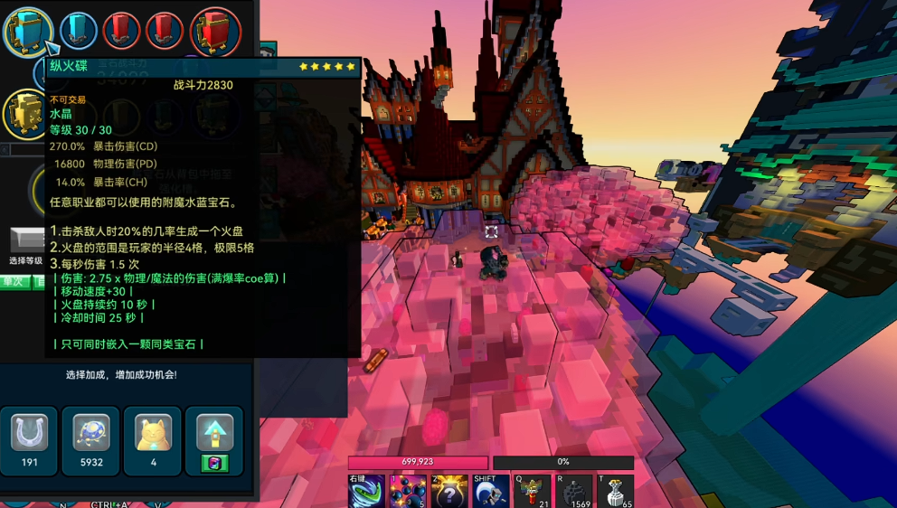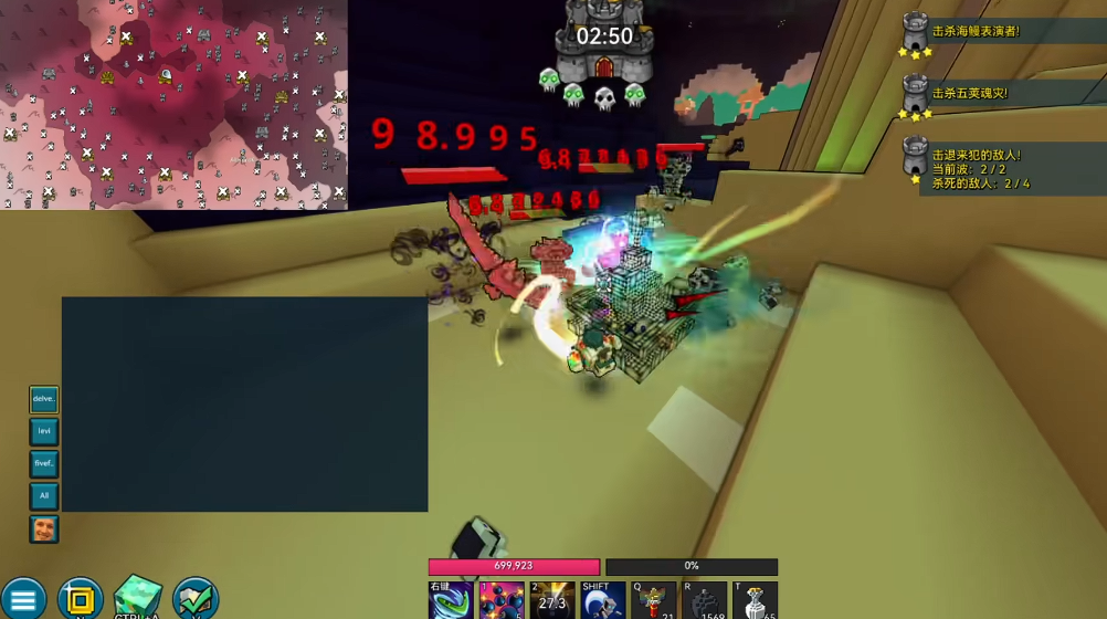 被动技能让第三次普攻有特殊效果,剑形态会转圈造成范围伤害,弓形态会射出三支箭。一技能扔出的炸弹伤害一般,但能炸掉6x6范围的方块,挖矿特别方便。大招扔出的超级炸弹会瞬间爆炸,有四种随机效果:给全队回血、减技能CD、召唤小炸弹或三只小鸡。职业宝石能让大招必出三只小鸡,每只小鸡能造成可观的伤害。