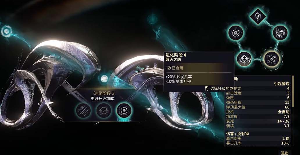 进化4的毁灭之怒与进化5的毁灭损耗可大幅提升暴击率与暴击伤害,但需以进化2的射速为基础支撑。若玩家倾向于爆发输出,可在进化2保留基础射速后,后续阶段全力堆叠暴击属性。这种组合对精准度要求较高,需通过实战适应武器后坐力。灵化形态下的辐射伤害对抗特定敌人有奇效,但需注意其对抗护盾单位的弱势。