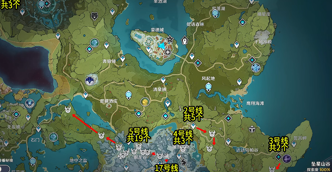 眠龙谷区域可收集14个徽记,雪葬之都·近郊附近有3个,左上角还有2个。翠玦坡路线能获取8个徽记,遁玉陵区域通过左上角传送点可快速收集16个,这是单区域收益最高的地点。灵矩关附近传送点周围有5个目标,巨渊之口两侧传送点各分布3个敌人,主矿区上下层共8个目标。
