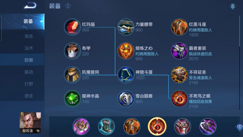 接下来说说出装,核心就是要在肉和冷却缩减上找到平衡,同时也可以考虑加入一点攻击属性。鞋子方面抵抗之靴几乎是必出的,因为单挑时最怕被控制住一套带走,抵抗鞋能减少被控时间,让你更容易开出大招。核心防御装备推荐极寒风暴和不死鸟之眼,极寒风暴提供大量物理防御和冷却缩减,被动还能减速敌人,让你能黏住对手打;不死鸟之眼是程咬金的灵魂装备,能大幅提升大招的回血效果,让你残血时一个大招就能把血线抬上来,法术防御也能应对一些法伤对手。有了这两件装备,你的坦度和回复能力就有保证了。