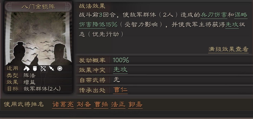 曹仁也非常专精于防御。他的统率属性成长很高,这直接决定了他的物理抗打击能力,智力和武力成长则相对均衡。在兵种上,他拥有盾兵的S级适应性,同时还有骑兵和枪兵的A级适应性,这让他搭配阵容时有一定的灵活性,但最主流也是最合适的还是让他带领盾兵出战。需他的速度成长比较低,这在大部分时候不是坏事,因为作为肉盾他常常希望后手行动来稳定保护队友,但这也意味着他容易被对方先手控制,好在他的自带战法提供洞察,完美解决了这个问题。关于这个武将是拆解战法还是保留使用,对于新手来说,第一个曹仁往往建议拆解,因为可以获得八门金锁阵这个非常有用的阵法战法,但如果你实在缺少核心武将组成队伍,用他作为过渡的肉盾也是个实选择。