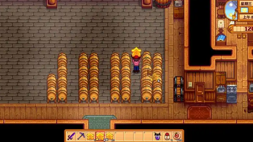 拥有酒窖后,你可以将普通的果酒或蔬菜汁放入其中的木桶进行陈酿。时间的推移,酒的品质会逐步提升,从普通无星慢慢变成银星、金星,最终达到最高铱星品质,每一种品质的提升都能让出售价格显著增加。解锁酒窖的过程虽然需要较多前期投入,但它能为你的农场经营带来长远的收益增长。通过陈酿系统,你可以将基础作物的价值最大化,这也是游戏中后期一个非常划算的投资方向。