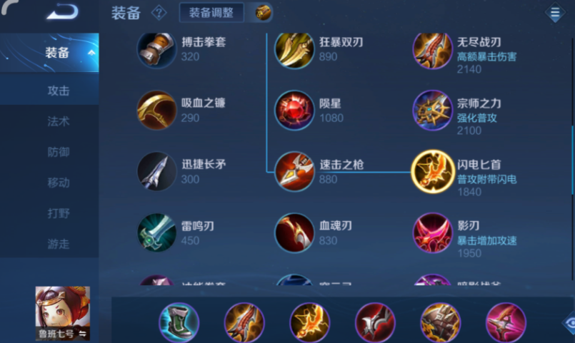 有了末世和鞋子打底,接下来的两件装备是鲁班输出质变的核心,顺序一般是无尽战刃接闪电匕首。无尽战刃提供高额的暴击率和暴击效果,能让你的普攻和被动扫射伤害产生飞跃,真正开始拥有秒人能力。而闪电匕首则进一步补充攻速和暴击率,并且它的电弧效果可以帮你快速清线,积累经济优势。出到这里,你的伤害已经非常可观了,但你会发现面对出了护甲的战士和坦克还是有点刮痧,同时自己的吸血可能也不太够用,这时候就需要关键的穿透和续航装备了。