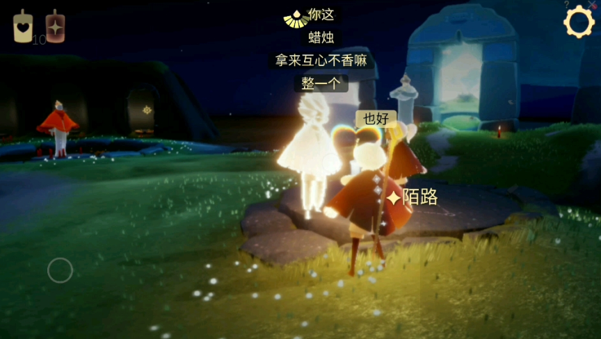 你在路上遇到的那些灰色或黑色的小人,都是其他玩家。用你手中的蜡烛点亮他们,你们就能看到彼此的样子,这算是打了个招呼。如果想成为能一直联系的好友,就需要赠送一根蜡烛来建立友谊树。你们可以继续花费蜡烛解锁牵手、拥抱、交谈等更多互动动作。一开始蜡烛宝贵,建议先解锁击掌或牵手,这样就能跟着朋友一起跑图,让他当你的充电宝——牵着飞行能缓慢恢复能量。游戏里还有很多公共聊天设施,比如长椅,坐在上面就能和附近的陌生人说话。交友贵在真诚,这是一段温暖的旅程。