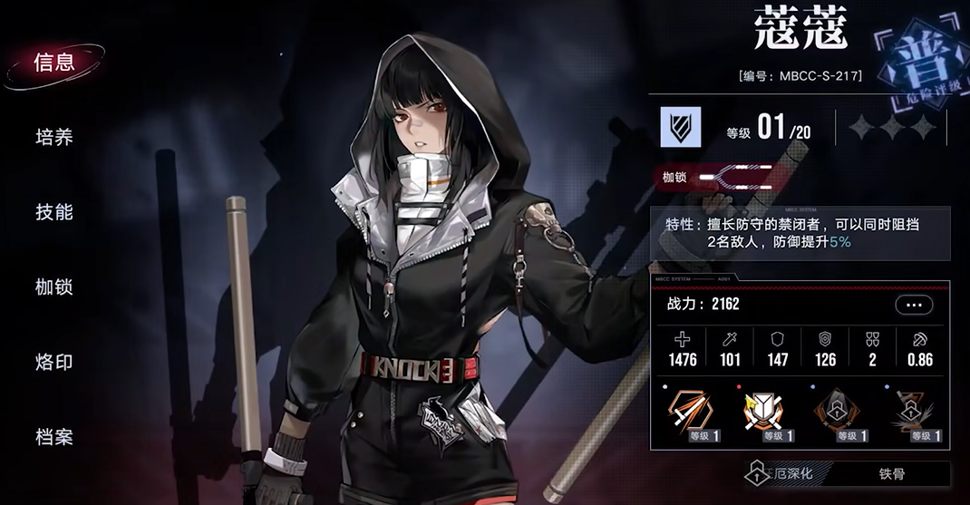 蔻蔻在游戏中作为一名普级坚韧系禁闭者,主要承担物理防御和阻挡敌人的职责,她在游戏初期作为坦克角色具有一定实用价值。蔻蔻属于白记实业员工,拥有伤痛无视的异能,能够在一定程度上无视肉体伤痛并强制反击,从而提供不错的战斗续航能力。作为普级角色,她容易获取和培养,适合新手玩家在资源有限时用作过渡选择。她的基础属性偏向防御,能够同时阻挡两名敌人,这在前期关卡中能有效保护后排输出单位。蔻蔻的输出能力较弱,无法承担主要伤害职责,玩家需要搭配其他角色来弥补队伍短板。