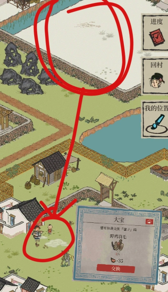 与大宝成功交互后,玩家可以获取一个名为毽子的奖励物品。获得此奖励并非无偿,需要支付一定的资源作为消耗。玩家需要准备5个野鸡羽毛并消耗35点体力。野鸡羽毛可以通过地图上的特定方式收集,而体力则是进行各类探险活动的基础资源,需要合理规划使用。在交付所需材料后,即可从大宝处换得毽子。