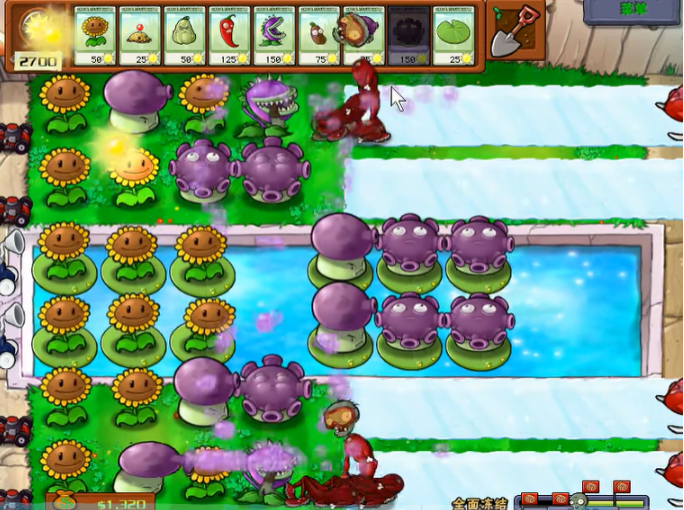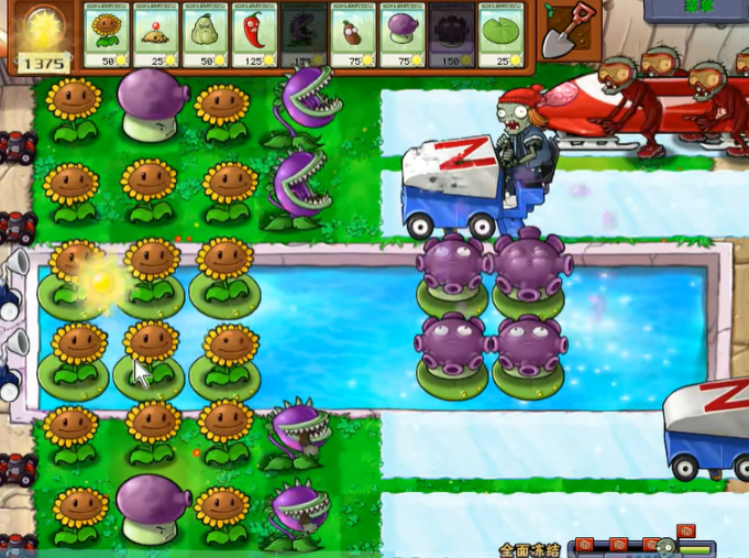 前期的发展需要快速积累阳光并应对初期威胁。开局优先在后两排种向日葵,阳光充足后补豌豆射手。水上僵尸不多,初期可以暂时不管,专注陆地防御,水草刷新就种水草来应急。关键是要迅速处理掉蓝色的雪橇僵尸,它是制造冰道的罪魁祸首,必须优先用窝瓜或地刺解决它们,只要它出来就被秒了,就不会出现红色雪橇僵尸了。