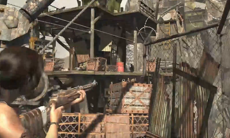 战斗结束后,通往葛林的楼梯被炸毁,需要另寻他路。根据生存本能的指引前进,在风车处需要看准时机跳到对面平台。跳过风车后,会看到一个货物运输通道,跳上去可以继续前进。如果直走后左转下楼探索,可以发现一些资源收集点和第五个支线古墓的入口。继续沿着主路在货物通道上行进,到半途会触发剧情,劳拉坠落并需要对付另一大波敌人。这个场景同样有两根绳索,不断有敌人从对面荡过来,其中还混杂着不少投弹兵。此时火箭箭矢已经解锁,可以用来射击投弹兵手中的炸药包,让他们自爆并波及周围敌人,这是高效清理人群的绝佳方法。