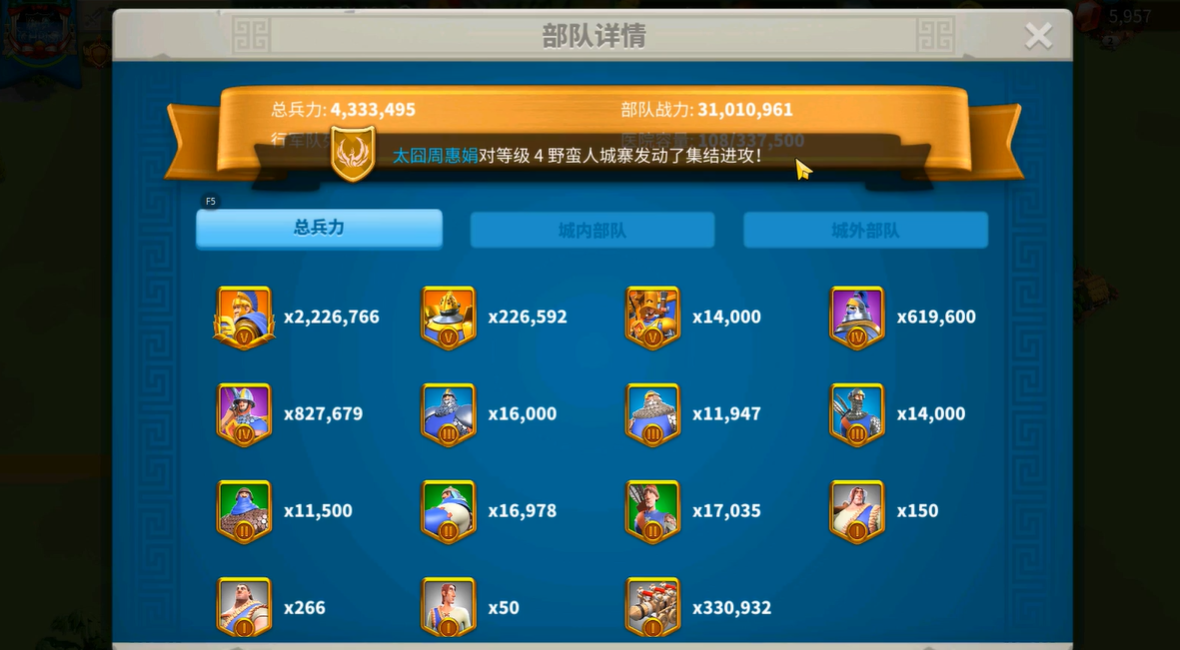 掠夺别人物资的关键在于掌握攻城技巧、部队分配和侦察策略。首先咱们要明白,攻击别人的城市是会损失自己士兵的,而且只要一开始攻击,重伤的部队就直接死亡了,所以一定要计算好投入和回报,别抢来的资源还不够补兵的消耗。建议优先选择医院容量低的对手下手,这样他们的重伤兵种会更快死亡。掠夺物资不是单打独斗的活,最好和盟友配合行动才能最大化收益。