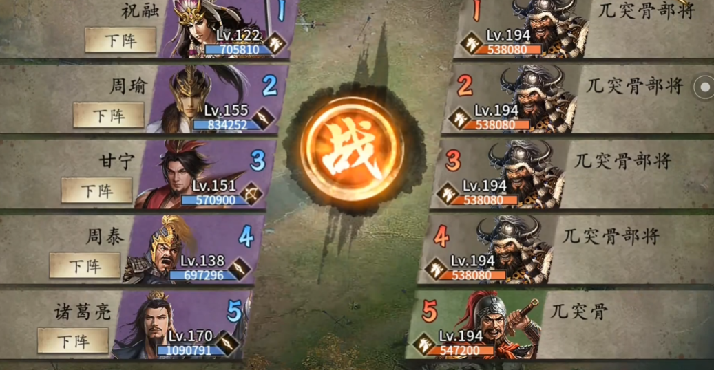 接下来派上周瑜,觉醒后的周瑜随便穿什么御宝都行,灵龟套装就很合适。不管祝融前面打得怎么样,周瑜上场就直接放战法,然后平砍输出。周瑜的任务是清理残局,如果祝融发挥得好,周瑜的压力会小很多。记得别给周瑜带副将,副将会乱放战法影响节奏。