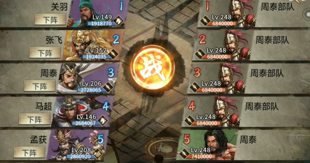 攻城掠地248级周泰副本是游戏中难度较高的水域地形关卡,NPC拥有类似未觉醒孙策的强力buff,对玩家的武将配置和战术操作有较高要求。核心通关思路是围绕周泰构建四保一阵容,将最优装备和克制兵书集中给周泰,同时利用曹操、关羽等武将进行战术配合。关键配置包括五车觉醒曹操带烛龙副将夏侯渊控制血量,三车周泰灵龟携带固若金汤和高级军略,以及一车孟获驱虎配合陆逊或马超进行收尾。