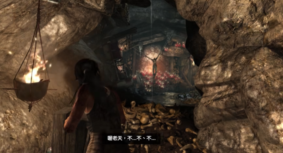 游戏开局阶段,劳拉从昏迷中醒来发现自己被倒吊在洞穴中,需要快速交替按左右方向键(键盘AD键/手柄左右摇杆)使身体摆动。摆动幅度需达到最大后再换方向,通过反复摆动让劳拉触碰到附近的火源,利用火焰烧断绳索脱离束缚。脱离后劳拉会从高处坠落并被铁钉刺伤,需连续按互动键(键盘E键/手柄对应按键)拔出铁钉。