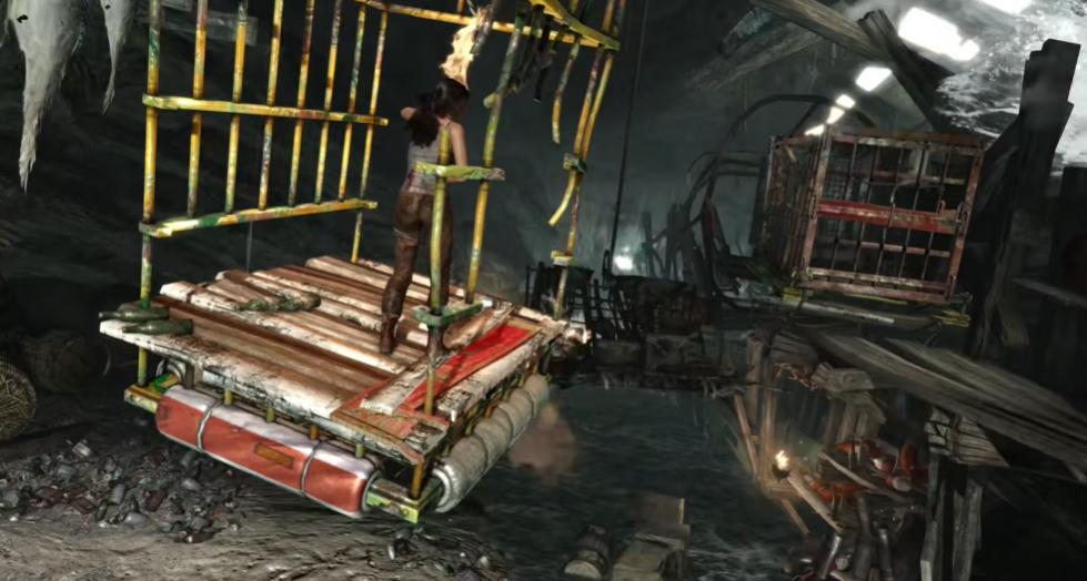 挣脱束缚后,劳拉需在洞穴中寻找出路。沿途可拾取左手边的火炬作为光源和工具,火炬能点燃障碍物开辟路径。遇到被货物堵塞的通道时,长按互动键点燃货物烧出一条生路。穿过缝隙后启动生存本能(键盘Q键/手柄对应按键)高亮显示可交互物体,利用环境中的火盆重新点燃被水淋湿的火炬。攀爬至木架顶部点燃悬挂的布条,火势蔓延至对面引爆油桶炸开通道。