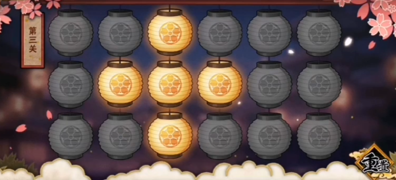 第三关开始引入障碍机制,部分初始点亮的花灯会干扰判断。需要优先处理边缘区域的花灯,按照从外到内的顺序依次点击。具体操作为点击左上角和右下角的花灯,通过两次十字架叠加消除中间区域的干扰。这种分区域处理的策略在后续高阶关卡中尤为重要。