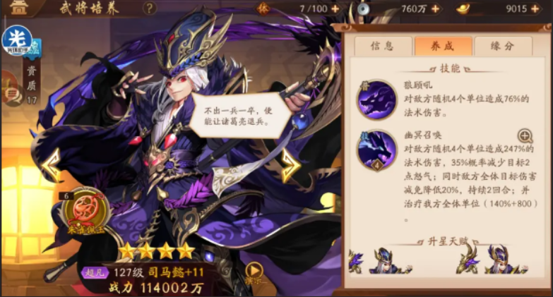 紫金武将的培养优先级要搞清楚,曹节和张辽必须最先升星,他俩是输出的主力。曹操虽然控制强但不用急着堆太高星,够用就行。司马懿放在最后是因为他的奶量够用,星级低点也能凑合。进阶石每天记得在竞技商店和巡逻里攒,优先喂给紫金2的武将,属性压制比单纯堆战力更重要。