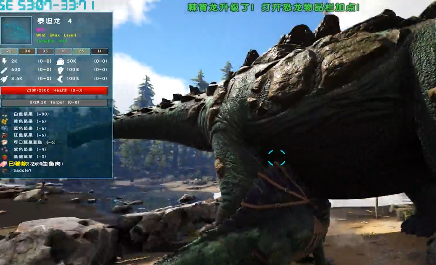 击晕后赶紧把平台鞍装上去,驯服就算完成了,但别以为这就万事大吉了,它被驯服后就开始绝食,不吃不喝,大概16到20小时后就会饿死,所以你驯服后要赶紧用上它,搬运资源或拆敌方建筑都行,毕竟它的战斗力在游戏里数一数二。驯服后的泰坦龙血量会比野生时少8万,不过还是能碾压大多数生物,记得提前规划好任务,别浪费了这短暂的时间。