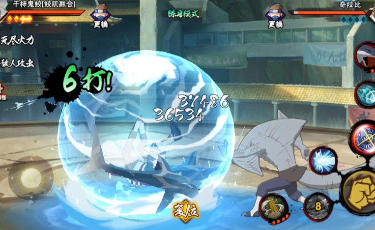 觉醒进入鲛肌融合形态的干柿鬼鲛,其战斗风格发生了显著转变。这个形态下的鬼鲛外观接近鲛人,核心优势在于其突进能力极为出色,技能起手速度很快,能在对局中迅速贴近敌人发动攻势。这种强力的正面压制能力也伴一定的弱点,他主要擅长在X轴上进行攻击,对于擅长上下移动、频繁使用Y轴位移来拉扯身法的对手会显得有些被动。驾驭这个忍者的关键在于扬长避短,充分发挥其突进和起手优势,同时通过灵活的走位来弥补Y轴攻击手段的相对缺乏。