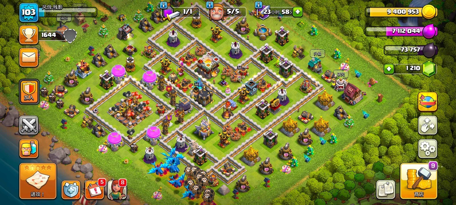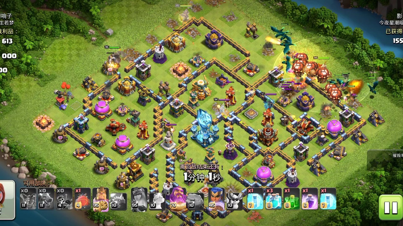 兵种技能是三星进攻的输出基础,雷龙的链式闪电可同时攻击多个目标,一字划推进时能快速清理密集防御,搭配气球可优先清除防空火箭与空气炮;野猪骑士无视墙体直接攻击防御,搭配治疗法术能持续推进,需避开巨型炸弹与单头地狱塔;矿工可地下穿行规避地面防御,适合拆墙与清理内部防御,配合野猪形成矿猪流互补输出;根蔓武神能控制墙体并造成范围伤害,搭配隐身法术可无伤推进,适配复杂护本阵型;龙骑士的火焰攻击伤害高且范围广,配合永王金身能稳定突破重火力防线,是高本三星的核心兵种。