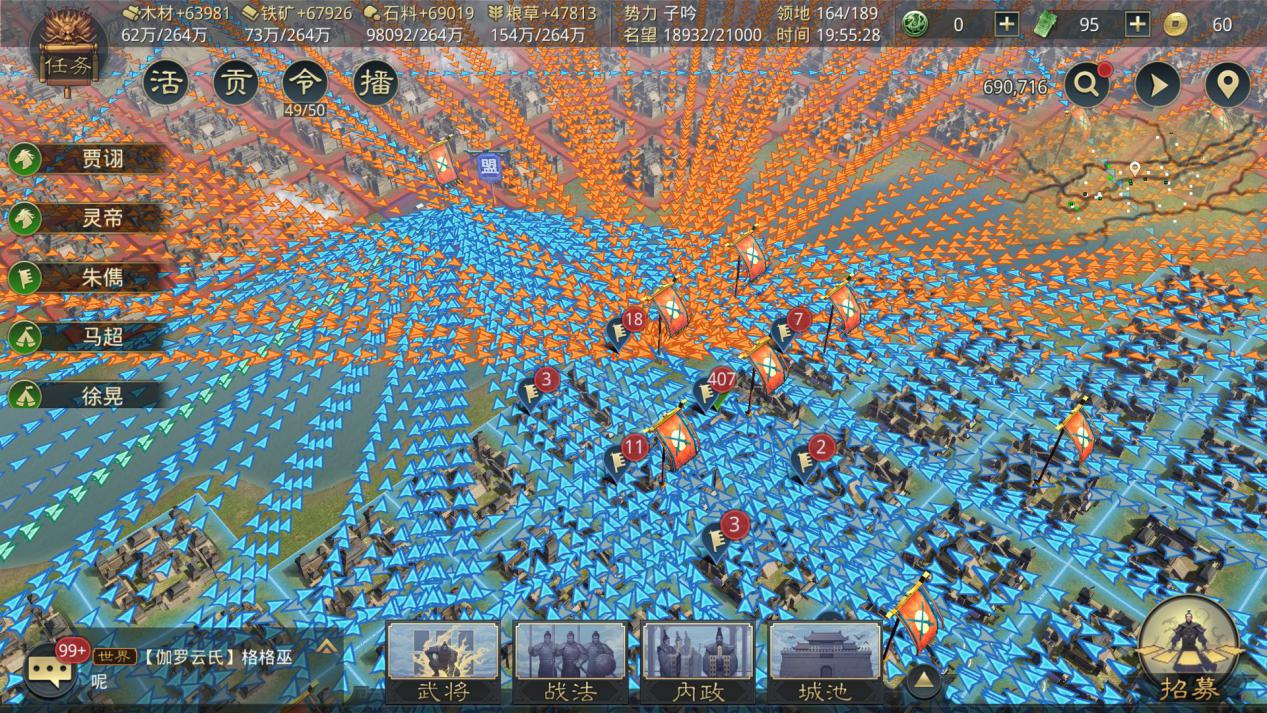 陆逊坐镇大营担任核心输出,全谋略加点,兵种选择长枪文韬列阵,携带胜兵求战与深谋远虑,胜兵求战大概率跳过火势风威的准备回合,实现瞬发群体火攻,深谋远虑持续叠加谋略伤害,让每一轮火攻都能打出更高爆发,宝物优先熟虑词条提升主动战法释放概率,陆逊需保证速度慢于周瑜快于吕蒙,确保增伤buff完美覆盖,火势风威的群体燃烧搭配周瑜的引爆效果,可快速压低敌方全员兵力,即便面对多队联防,也能凭借持续AOE打出高额武勋。