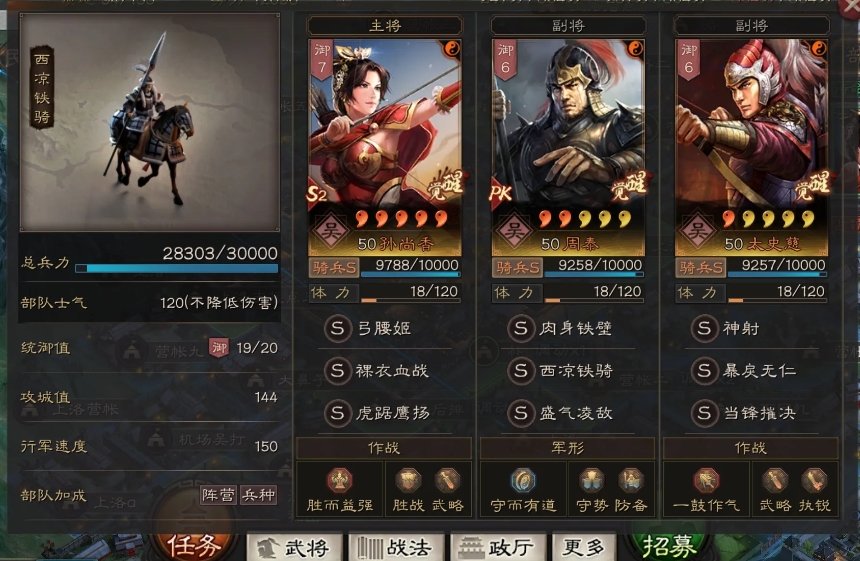 战法搭配分输出与续航两条路线,输出流带绝地反击+乘胜长驱,承伤叠加武力,每回合递增伤害,契合持久战特性;续航流选后发制人+千里驰援,嘲讽承伤触发反击,保护队友同时强化自身输出。SP董卓可换飞熊军+武锋阵,受治疗叠加统率与智力,后期属性破千,配合董白双治疗、吕布主输出,形成攻防一体的黑科技阵容,面对兵刃队能打出高额伤害与稳定续航。